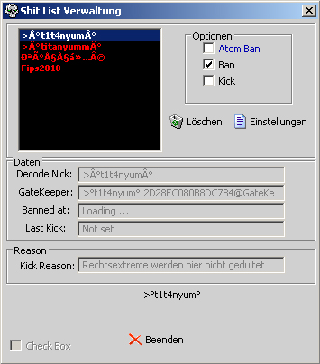 In der Liste wo wir nun die roten Nicks sehen stehen die Namen immer als undecoded. Wenn ihr ihn nun markiert, seht ihr den Namen als encoded ueber dem Button Beenden. Seinen Gatekeeper, Banned at (Wann er das erste mal gebannt wurde), Last Kick (Sein letzter kick aus dem Chat) und die Kick reason wo wir eine nachricht beim Kicken angegeben haben.